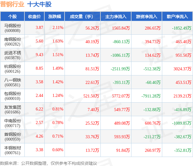 个股表现方面,普钢行业当日领涨股为马钢股份(600808),该股当日报收3.87,上涨2.11%,成交量56.26万,主力资金净流入1565.84万元。南钢股份(600282)以上涨1.63%紧随其后,该股当日成交量40.19万,主力资金净流出860.13万元。除此之外,武进不锈(603878)、杭钢股份(600126)、八一钢铁(600581)均进入当日牛股之列。具体个股列表见下表: