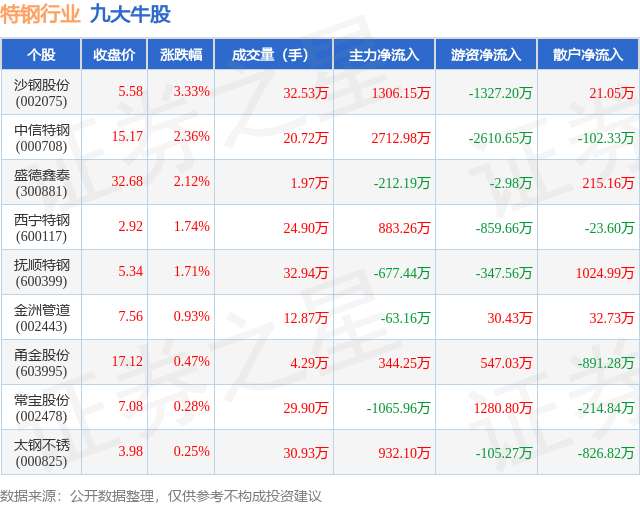 个股表现方面,特钢行业当日领涨股为沙钢股份(002075),该股当日报收5.58,上涨3.33%,成交量32.53万,主力资金净流入1306.15万元。中信特钢(000708)以上涨2.36%紧随其后,该股当日成交量20.72万,主力资金净流入2712.98万元。除此之外,盛德鑫泰(300881)、西宁特钢(600117)、抚顺特钢(600399)均进入当日牛股之列。具体个股列表见下表: