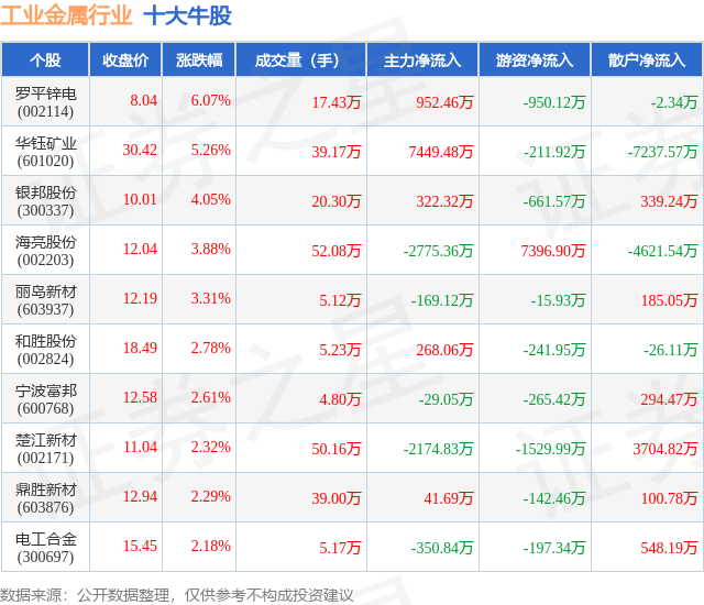 个股表现方面,工业金属行业当日领涨股为罗平锌电(002114),该股当日报收8.04,上涨6.07%,成交量17.43万,主力资金净流入952.46万元。华钰矿业(601020)以上涨5.26%紧随其后,该股当日成交量39.17万,主力资金净流入7449.48万元。除此之外,银邦股份(300337)、海亮股份(002203)、丽岛新材(603937)均进入当日牛股之列。具体个股列表见下表: