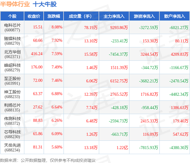 个股表现方面,半导体行业当日领涨股为电科芯片(600877),该股当日报收15.51,上涨8.08%,成交量78.19万,主力资金净流入9293.86万元。臻镭科技(688270)以上涨7.92%紧随其后,该股当日成交量13.1万,主力资金净流出233.41万元。除此之外,北方华创(002371)、峰岹科技(688279)、至正股份(603991)均进入当日牛股之列。具体个股列表见下表: