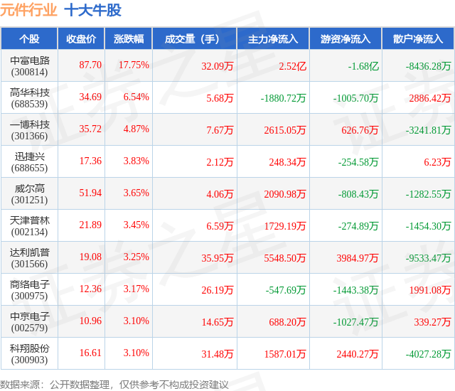 个股表现方面,元件行业当日领涨股为中富电路(300814),该股当日报收87.7,上涨17.75%,成交量32.09万,主力资金净流入2.52亿元。高华科技(688539)以上涨6.54%紧随其后,该股当日成交量5.68万,主力资金净流出1880.72万元。除此之外,一博科技(301366)、迅捷兴(688655)、威尔高(301251)均进入当日牛股之列。具体个股列表见下表:
