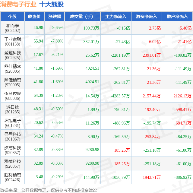 个股表现方面,消费电子行业当日领跌股为和而泰(002402),该股当日报收46.98,下跌9.65%,成交量100.73万,主力资金净流出8.15亿元。工业富联(601138)以下跌7.8%紧随其后,该股当日成交量332.01万,主力资金净流出27.43亿元。除此之外,盈趣科技(002925)、鼎佳精密(920005)、鼎佳精密(920005)均进入当日熊股之列。具体个股列表见下表: