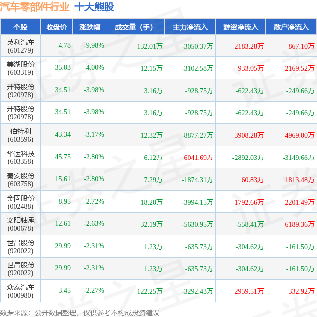 个股表现方面,汽车零部件行业当日领跌股为英利汽车(601279),该股当日报收4.78,下跌9.98%,成交量132.01万,主力资金净流出3050.37万元。美湖股份(603319)以下跌4.0%紧随其后,该股当日成交量12.15万,主力资金净流出3102.58万元。除此之外,开特股份(920978)、开特股份(920978)、伯特利(603596)均进入当日熊股之列。具体个股列表见下表: