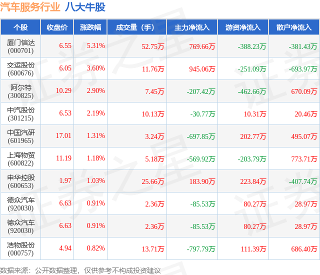 个股表现方面,汽车服务行业当日领涨股为厦门信达(000701),该股当日报收6.55,上涨5.31%,成交量52.75万,主力资金净流入769.66万元。交运股份(600676)以上涨3.6%紧随其后,该股当日成交量11.76万,主力资金净流入945.06万元。除此之外,阿尔特(300825)、中汽股份(301215)、中国汽研(601965)均进入当日牛股之列。具体个股列表见下表: