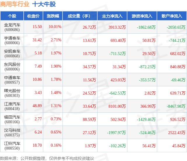 个股表现方面,商用车行业当日领涨股为金龙汽车(600686),该股当日报收15.5,上涨10.01%,成交量26.72万,主力资金净流入3913.32万元。宇通客车(600066)以上涨2.71%紧随其后,该股当日成交量13.61万,主力资金净流入693.4万元。除此之外,安凯客车(000868)、东风股份(600006)、中通客车(000957)均进入当日牛股之列。具体个股列表见下表: