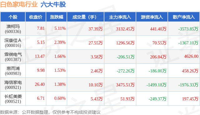 个股表现方面,白色家电行业当日领涨股为澳柯玛(600336),该股当日报收7.81,上涨5.11%,成交量37.39万,主力资金净流入3132.45万元。深康佳A(000016)以上涨2.39%紧随其后,该股当日成交量27.55万,主力资金净流入1296.56万元。除此之外,雪祺电气(001387)、惠而浦(600983)、海信家电(000921)均进入当日牛股之列。具体个股列表见下表: