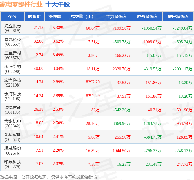 个股表现方面,家电零部件行业当日领涨股为海立股份(600619),该股当日报收21.15,上涨5.38%,成交量60.64万,主力资金净流入7199.58万元。春光科技(603657)以上涨3.62%紧随其后,该股当日成交量7.71万,主力资金净流出503.78万元。除此之外,三星新材(603578)、禾盛新材(002290)、宏海科技(920108)均进入当日牛股之列。具体个股列表见下表: