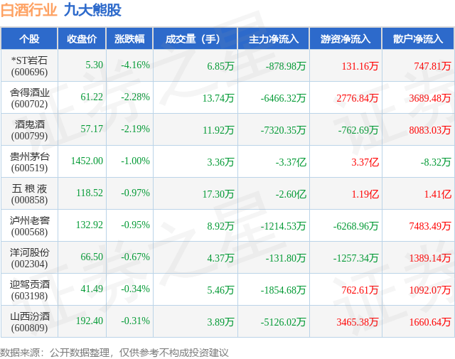个股表现方面,白酒行业当日领跌股为*ST岩石(600696),该股当日报收5.3,下跌4.16%,成交量6.85万,主力资金净流出878.98万元。舍得酒业(600702)以下跌2.28%紧随其后,该股当日成交量13.74万,主力资金净流出6466.32万元。除此之外,酒鬼酒(000799)、贵州茅台(600519)、五 粮 液(000858)均进入当日熊股之列。具体个股列表见下表: