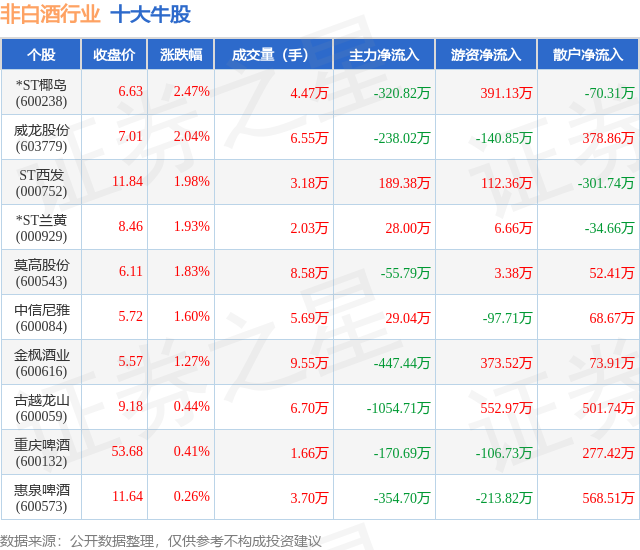 个股表现方面,非白酒行业当日领涨股为*ST椰岛(600238),该股当日报收6.63,上涨2.47%,成交量4.47万,主力资金净流出320.82万元。威龙股份(603779)以上涨2.04%紧随其后,该股当日成交量6.55万,主力资金净流出238.02万元。除此之外,ST西发(000752)、*ST兰黄(000929)、莫高股份(600543)均进入当日牛股之列。具体个股列表见下表: