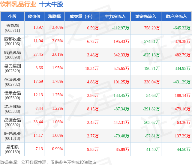 个股表现方面,饮料乳品行业当日领涨股为香飘飘(603711),该股当日报收13.97,上涨3.4%,成交量6.59万,主力资金净流出112.97万元。西部牧业(300106)以上涨2.03%紧随其后,该股当日成交量6.72万,主力资金净流入195.43万元。除此之外,熊猫乳品(300898)、皇氏集团(002329)、燕塘乳业(002732)均进入当日牛股之列。具体个股列表见下表: