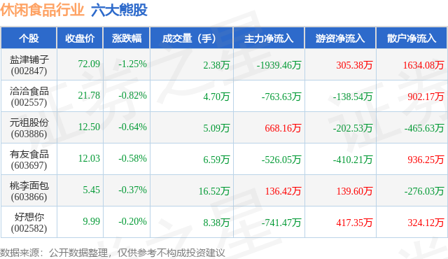 个股表现方面,休闲食品行业当日领跌股为盐津铺子(002847),该股当日报收72.09,下跌1.25%,成交量2.38万,主力资金净流出1939.46万元。洽洽食品(002557)以下跌0.82%紧随其后,该股当日成交量4.7万,主力资金净流出763.63万元。除此之外,元祖股份(603886)、有友食品(603697)、桃李面包(603866)均进入当日熊股之列。具体个股列表见下表: