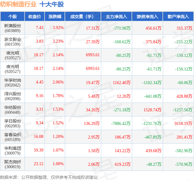 个股表现方面,纺织制造行业当日领涨股为新澳股份(603889),该股当日报收7.43,上涨3.92%,成交量17.31万,主力资金净流出771.98万元。浙文影业(601599)以上涨3.23%紧随其后,该股当日成交量27.39万,主力资金净流出160.62万元。除此之外,夜光明(920527)、夜光明(920527)、华孚时尚(002042)均进入当日牛股之列。具体个股列表见下表: