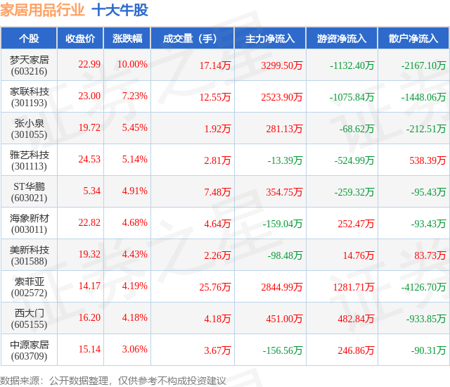 个股表现方面,家居用品行业当日领涨股为梦天家居(603216),该股当日报收22.99,上涨10.0%,成交量17.14万,主力资金净流入3299.5万元。家联科技(301193)以上涨7.23%紧随其后,该股当日成交量12.55万,主力资金净流入2523.9万元。除此之外,张小泉(301055)、雅艺科技(301113)、ST华鹏(603021)均进入当日牛股之列。具体个股列表见下表: