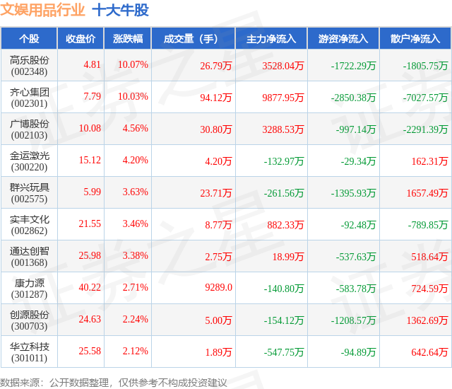 个股表现方面,文娱用品行业当日领涨股为高乐股份(002348),该股当日报收4.81,上涨10.07%,成交量26.79万,主力资金净流入3528.04万元。齐心集团(002301)以上涨10.03%紧随其后,该股当日成交量94.12万,主力资金净流入9877.95万元。除此之外,广博股份(002103)、金运激光(300220)、群兴玩具(002575)均进入当日牛股之列。具体个股列表见下表: