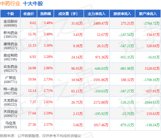 个股表现方面,中药行业当日领涨股为金花股份(600080),该股当日报收8.62,上涨3.48%,成交量31.02万,主力资金净流入2489.47万元。新光药业(300519)以上涨3.48%紧随其后,该股当日成交量3.43万,主力资金净流入12.67万元。除此之外,康缘药业(600557)、嘉应制药(002198)、众生药业(002317)均进入当日牛股之列。具体个股列表见下表: