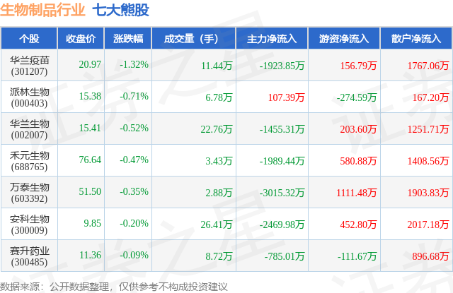 个股表现方面,生物制品行业当日领跌股为华兰疫苗(301207),该股当日报收20.97,下跌1.32%,成交量11.44万,主力资金净流出1923.85万元。派林生物(000403)以下跌0.71%紧随其后,该股当日成交量6.78万,主力资金净流入107.39万元。除此之外,华兰生物(002007)、禾元生物(688765)、万泰生物(603392)均进入当日熊股之列。具体个股列表见下表: