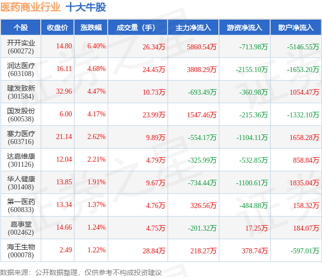 个股表现方面,医药商业行业当日领涨股为开开实业(600272),该股当日报收14.8,上涨6.4%,成交量26.34万,主力资金净流入5860.54万元。润达医疗(603108)以上涨4.68%紧随其后,该股当日成交量24.45万,主力资金净流入3808.29万元。除此之外,建发致新(301584)、国发股份(600538)、塞力医疗(603716)均进入当日牛股之列。具体个股列表见下表: