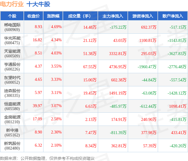 个股表现方面,电力行业当日领涨股为郴电国际(600969),该股当日报收8.93,上涨4.69%,成交量14.48万,主力资金净流出175.22万元。华光环能(600475)以上涨4.34%紧随其后,该股当日成交量21.12万,主力资金净流入43.03万元。除此之外,天富能源(600509)、亨通股份(600226)、东望时代(600052)均进入当日牛股之列。具体个股列表见下表: