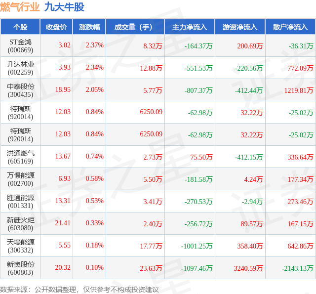 个股表现方面,燃气行业当日领涨股为ST金鸿(000669),该股当日报收3.02,上涨2.37%,成交量8.32万,主力资金净流出164.37万元。升达林业(002259)以上涨2.34%紧随其后,该股当日成交量12.88万,主力资金净流出551.53万元。除此之外,中泰股份(300435)、特瑞斯(920014)、特瑞斯(920014)均进入当日牛股之列。具体个股列表见下表: