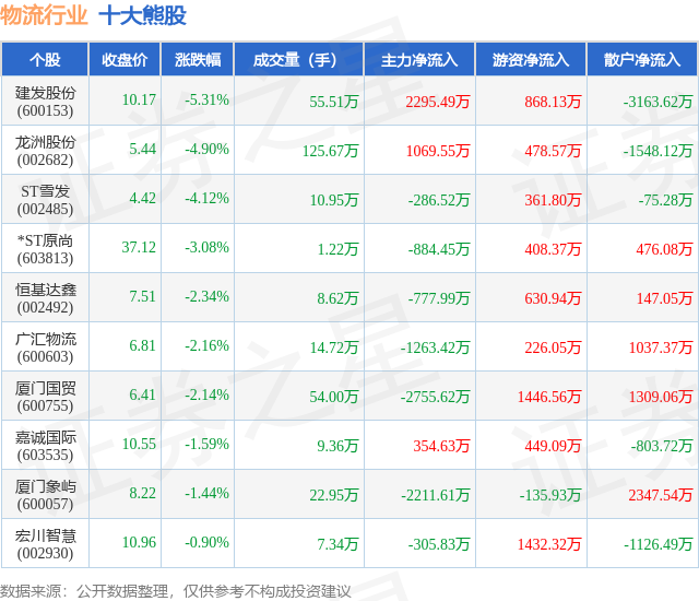 个股表现方面,物流行业当日领跌股为建发股份(600153),该股当日报收10.17,下跌5.31%,成交量55.51万,主力资金净流入2295.49万元。龙洲股份(002682)以下跌4.9%紧随其后,该股当日成交量125.67万,主力资金净流入1069.55万元。除此之外,ST雪发(002485)、*ST原尚(603813)、恒基达鑫(002492)均进入当日熊股之列。具体个股列表见下表: