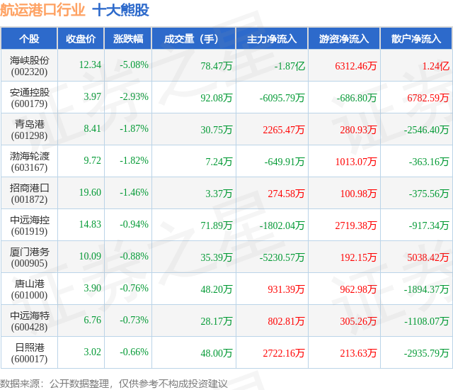 个股表现方面,航运港口行业当日领跌股为海峡股份(002320),该股当日报收12.34,下跌5.08%,成交量78.47万,主力资金净流出1.87亿元。安通控股(600179)以下跌2.93%紧随其后,该股当日成交量92.08万,主力资金净流出6095.79万元。除此之外,青岛港(601298)、渤海轮渡(603167)、招商港口(001872)均进入当日熊股之列。具体个股列表见下表: