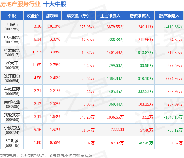 个股表现方面,房地产服务行业当日领涨股为世联行(002285),该股当日报收3.16,上涨10.1%,成交量275.95万,主力资金净流入3879.55万元。中天服务(002188)以上涨3.37%紧随其后,该股当日成交量17.39万,主力资金净流出386.38万元。除此之外,特发服务(300917)、新大正(002968)、珠江股份(600684)均进入当日牛股之列。具体个股列表见下表: