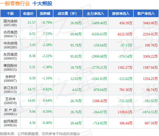 个股表现方面,一般零售行业当日领跌股为国光连锁(605188),该股当日报收21.57,下跌8.79%,成交量26.99万,主力资金净流出5499.4万元。合百集团(000417)以下跌7.53%紧随其后,该股当日成交量69.8万,主力资金净流出6356.63万元。除此之外,中央商场(600280)、东百集团(600693)、豫园股份(600655)均进入当日熊股之列。具体个股列表见下表: