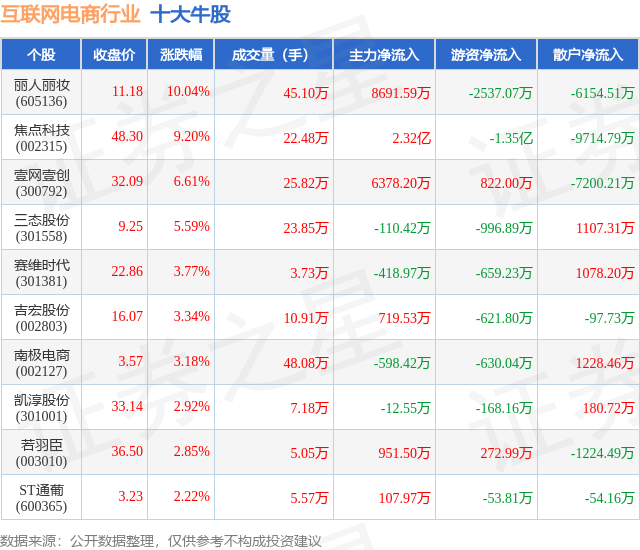 个股表现方面,互联网电商行业当日领涨股为丽人丽妆(605136),该股当日报收11.18,上涨10.04%,成交量45.1万,主力资金净流入8691.59万元。焦点科技(002315)以上涨9.2%紧随其后,该股当日成交量22.48万,主力资金净流入2.32亿元。除此之外,壹网壹创(300792)、三态股份(301558)、赛维时代(301381)均进入当日牛股之列。具体个股列表见下表:
