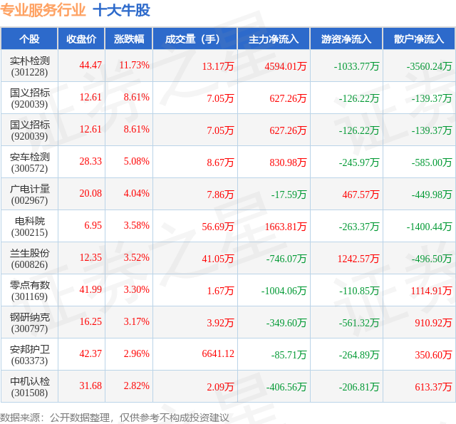 个股表现方面,专业服务行业当日领涨股为实朴检测(301228),该股当日报收44.47,上涨11.73%,成交量13.17万,主力资金净流入4594.01万元。国义招标(920039)以上涨8.61%紧随其后,该股当日成交量7.05万,主力资金净流入627.26万元。除此之外,国义招标(920039)、安车检测(300572)、广电计量(002967)均进入当日牛股之列。具体个股列表见下表: