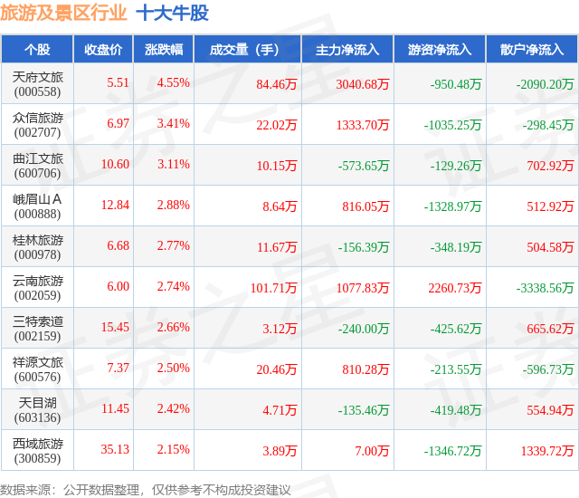 个股表现方面,旅游及景区行业当日领涨股为天府文旅(000558),该股当日报收5.51,上涨4.55%,成交量84.46万,主力资金净流入3040.68万元。众信旅游(002707)以上涨3.41%紧随其后,该股当日成交量22.02万,主力资金净流入1333.7万元。除此之外,曲江文旅(600706)、峨眉山A(000888)、桂林旅游(000978)均进入当日牛股之列。具体个股列表见下表: