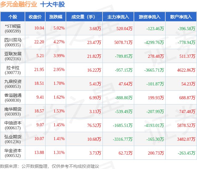 个股表现方面,多元金融行业当日领涨股为*ST熊猫(600599),该股当日报收10.04,上涨5.02%,成交量3.68万,主力资金净流入520.04万元。四川双马(000935)以上涨4.27%紧随其后,该股当日成交量23.47万,主力资金净流入5078.71万元。除此之外,亚联发展(002316)、拉卡拉(300773)、九鼎投资(600053)均进入当日牛股之列。具体个股列表见下表: