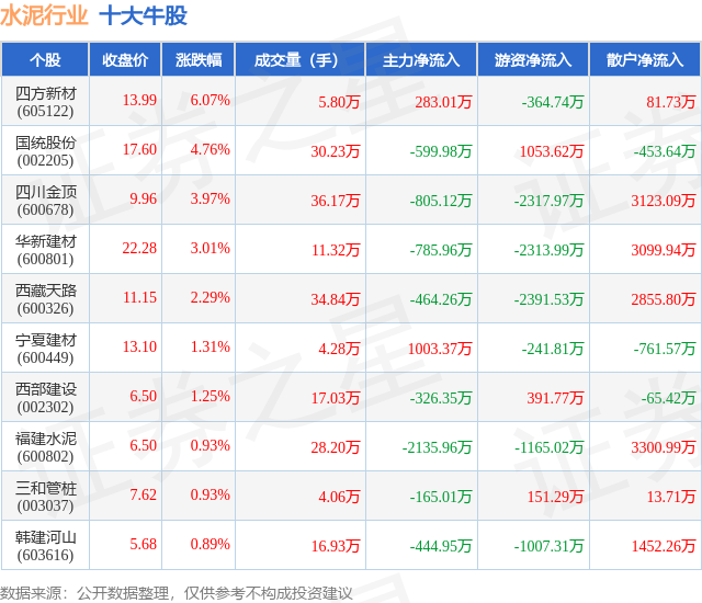 个股表现方面,水泥行业当日领涨股为四方新材(605122),该股当日报收13.99,上涨6.07%,成交量5.8万,主力资金净流入283.01万元。国统股份(002205)以上涨4.76%紧随其后,该股当日成交量30.23万,主力资金净流出599.98万元。除此之外,四川金顶(600678)、华新建材(600801)、西藏天路(600326)均进入当日牛股之列。具体个股列表见下表: