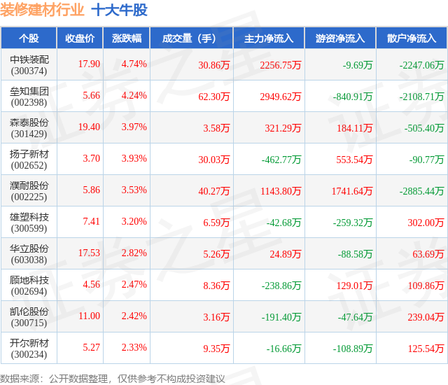 个股表现方面,装修建材行业当日领涨股为中铁装配(300374),该股当日报收17.9,上涨4.74%,成交量30.86万,主力资金净流入2256.75万元。垒知集团(002398)以上涨4.24%紧随其后,该股当日成交量62.3万,主力资金净流入2949.62万元。除此之外,森泰股份(301429)、扬子新材(002652)、濮耐股份(002225)均进入当日牛股之列。具体个股列表见下表: