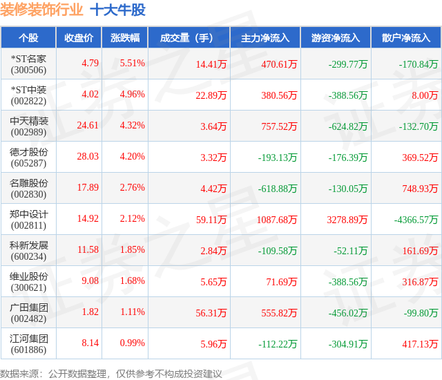 个股表现方面,装修装饰行业当日领涨股为*ST名家(300506),该股当日报收4.79,上涨5.51%,成交量14.41万,主力资金净流入470.61万元。*ST中装(002822)以上涨4.96%紧随其后,该股当日成交量22.89万,主力资金净流入380.56万元。除此之外,中天精装(002989)、德才股份(605287)、名雕股份(002830)均进入当日牛股之列。具体个股列表见下表:
