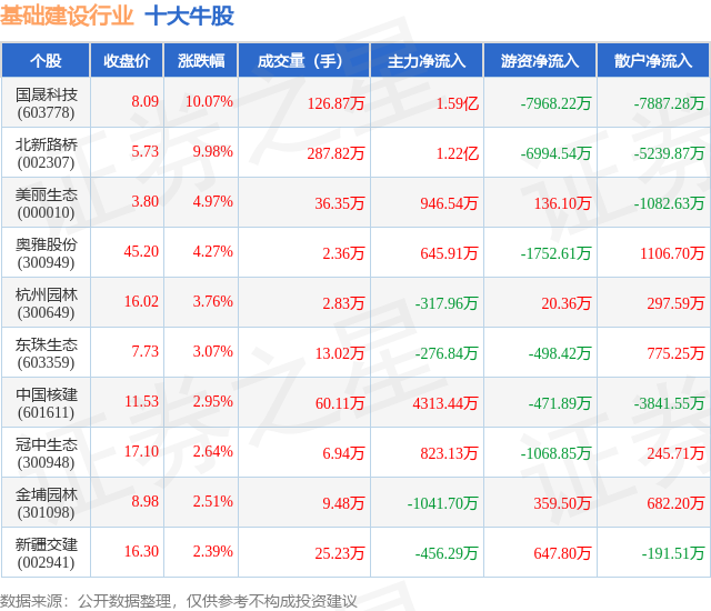 个股表现方面,基础建设行业当日领涨股为国晟科技(603778),该股当日报收8.09,上涨10.07%,成交量126.87万,主力资金净流入1.59亿元。北新路桥(002307)以上涨9.98%紧随其后,该股当日成交量287.82万,主力资金净流入1.22亿元。除此之外,美丽生态(000010)、奥雅股份(300949)、杭州园林(300649)均进入当日牛股之列。具体个股列表见下表:
