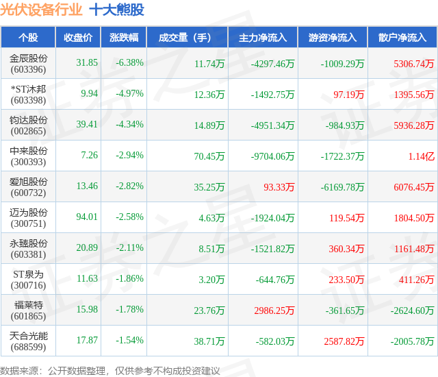 个股表现方面,光伏设备行业当日领跌股为金辰股份(603396),该股当日报收31.85,下跌6.38%,成交量11.74万,主力资金净流出4297.46万元。*ST沐邦(603398)以下跌4.97%紧随其后,该股当日成交量12.36万,主力资金净流出1492.75万元。除此之外,钧达股份(002865)、中来股份(300393)、爱旭股份(600732)均进入当日熊股之列。具体个股列表见下表: