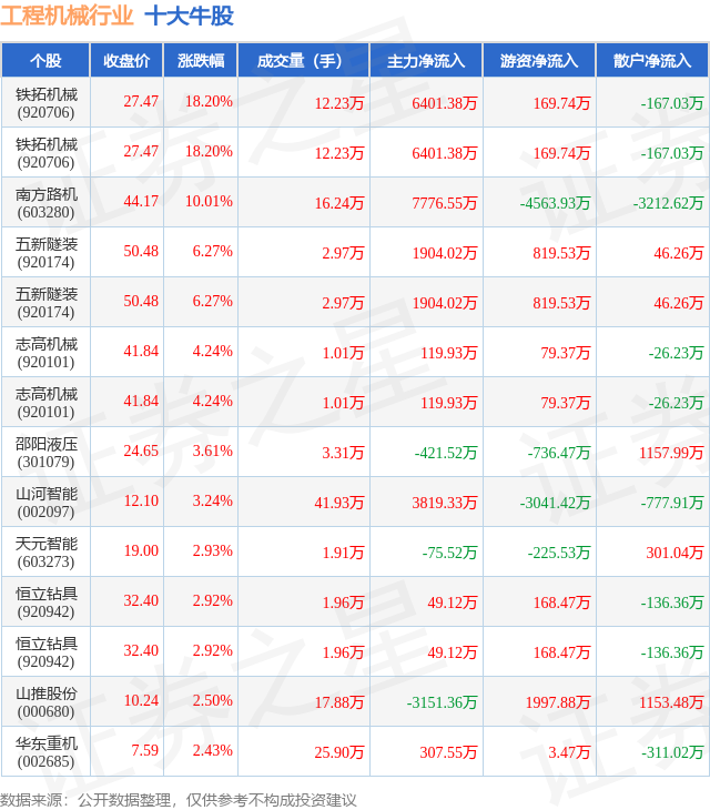个股表现方面,工程机械行业当日领涨股为铁拓机械(920706),该股当日报收27.47,上涨18.2%,成交量12.23万,主力资金净流入6401.38万元。铁拓机械(920706)以上涨18.2%紧随其后,该股当日成交量12.23万,主力资金净流入6401.38万元。除此之外,南方路机(603280)、五新隧装(920174)、五新隧装(920174)均进入当日牛股之列。具体个股列表见下表: