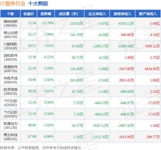 个股表现方面,IT服务行业当日领跌股为海峡创新(300300),该股当日报收12.58,下跌13.78%,成交量210.81万,主力资金净流出1.07亿元。常山北明(000158)以下跌7.86%紧随其后,该股当日成交量141.79万,主力资金净流出4.29亿元。除此之外,C南网数(301638)、润和软件(300339)、浪潮软件(600756)均进入当日熊股之列。具体个股列表见下表: