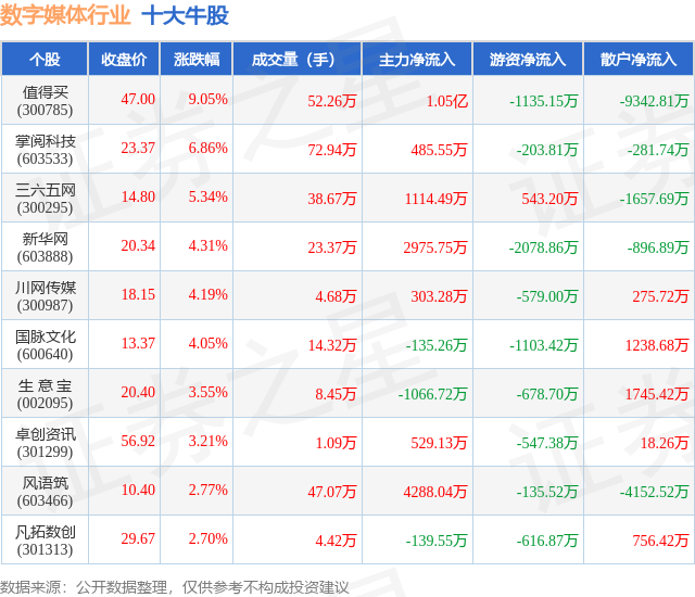 个股表现方面,数字媒体行业当日领涨股为值得买(300785),该股当日报收47.0,上涨9.05%,成交量52.26万,主力资金净流入1.05亿元。掌阅科技(603533)以上涨6.86%紧随其后,该股当日成交量72.94万,主力资金净流入485.55万元。除此之外,三六五网(300295)、新华网(603888)、川网传媒(300987)均进入当日牛股之列。具体个股列表见下表: