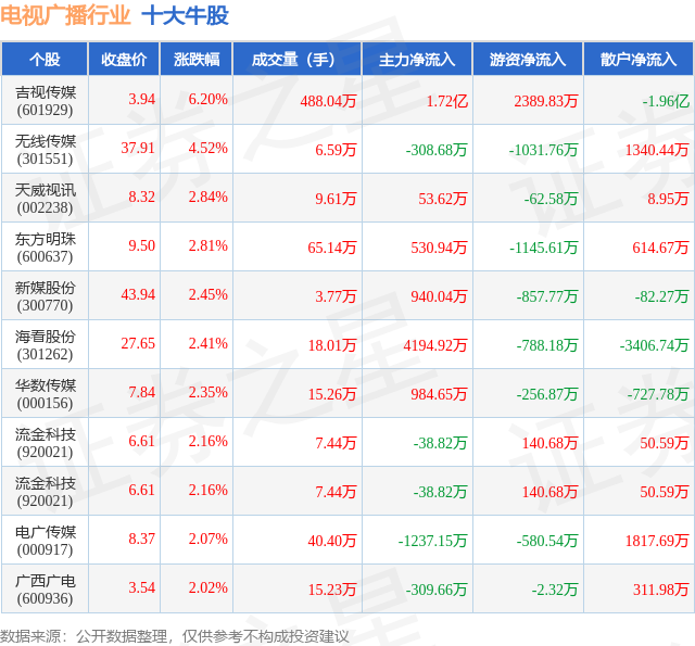 个股表现方面,电视广播行业当日领涨股为吉视传媒(601929),该股当日报收3.94,上涨6.2%,成交量488.04万,主力资金净流入1.72亿元。无线传媒(301551)以上涨4.52%紧随其后,该股当日成交量6.59万,主力资金净流出308.68万元。除此之外,天威视讯(002238)、东方明珠(600637)、新媒股份(300770)均进入当日牛股之列。具体个股列表见下表: