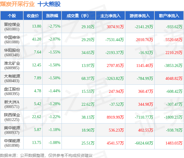 个股表现方面,煤炭开采行业当日领跌股为晋控煤业(601001),该股当日报收13.8,下跌2.75%,成交量29.1万,主力资金净流入3074.91万元。中国神华(601088)以下跌2.07%紧随其后,该股当日成交量29.29万,主力资金净流出7531.44万元。除此之外,华阳股份(600348)、淮北矿业(600985)、大有能源(600403)均进入当日熊股之列。具体个股列表见下表: