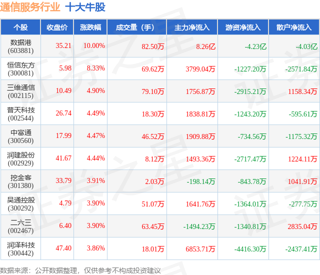 个股表现方面,通信服务行业当日领涨股为数据港(603881),该股当日报收35.21,上涨10.0%,成交量82.5万,主力资金净流入8.26亿元。恒信东方(300081)以上涨8.33%紧随其后,该股当日成交量69.62万,主力资金净流入3799.04万元。除此之外,三维通信(002115)、普天科技(002544)、中富通(300560)均进入当日牛股之列。具体个股列表见下表: