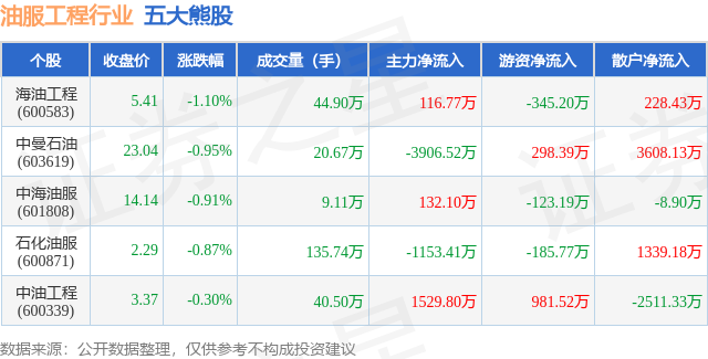 个股表现方面,油服工程行业当日领跌股为海油工程(600583),该股当日报收5.41,下跌1.1%,成交量44.9万,主力资金净流入116.77万元。中曼石油(603619)以下跌0.95%紧随其后,该股当日成交量20.67万,主力资金净流出3906.52万元。除此之外,中海油服(601808)、石化油服(600871)、中油工程(600339)均进入当日熊股之列。具体个股列表见下表: