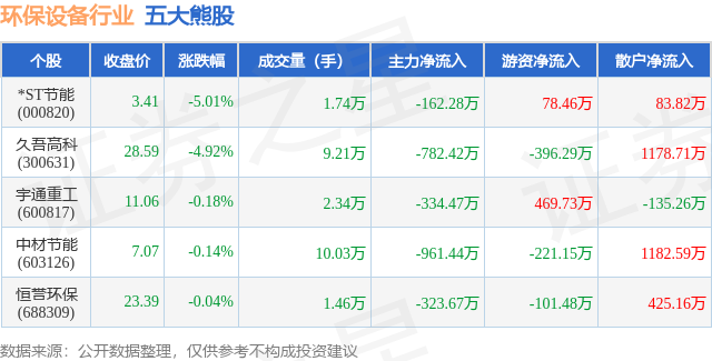 个股表现方面,环保设备行业当日领跌股为*ST节能(000820),该股当日报收3.41,下跌5.01%,成交量1.74万,主力资金净流出162.28万元。久吾高科(300631)以下跌4.92%紧随其后,该股当日成交量9.21万,主力资金净流出782.42万元。除此之外,宇通重工(600817)、中材节能(603126)、恒誉环保(688309)均进入当日熊股之列。具体个股列表见下表: