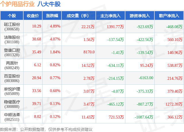 个股表现方面,个护用品行业当日领涨股为延江股份(300658),该股当日报收10.29,上涨4.89%,成交量22.21万,主力资金净流入1391.77万元。洁雅股份(301108)以上涨4.07%紧随其后,该股当日成交量1.56万,主力资金净流出137.54万元。除此之外,登康口腔(001328)、两面针(600249)、百亚股份(003006)均进入当日牛股之列。具体个股列表见下表:
