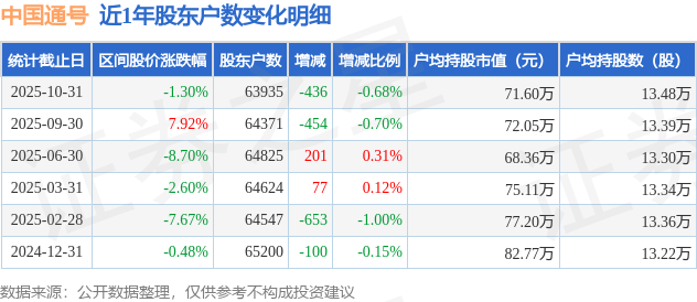 从股价来看,2025年9月30日至2025年10月31日,中国通号区间跌幅为1.3%,在此期间股东户数减少436.0户,减幅为0.68%。