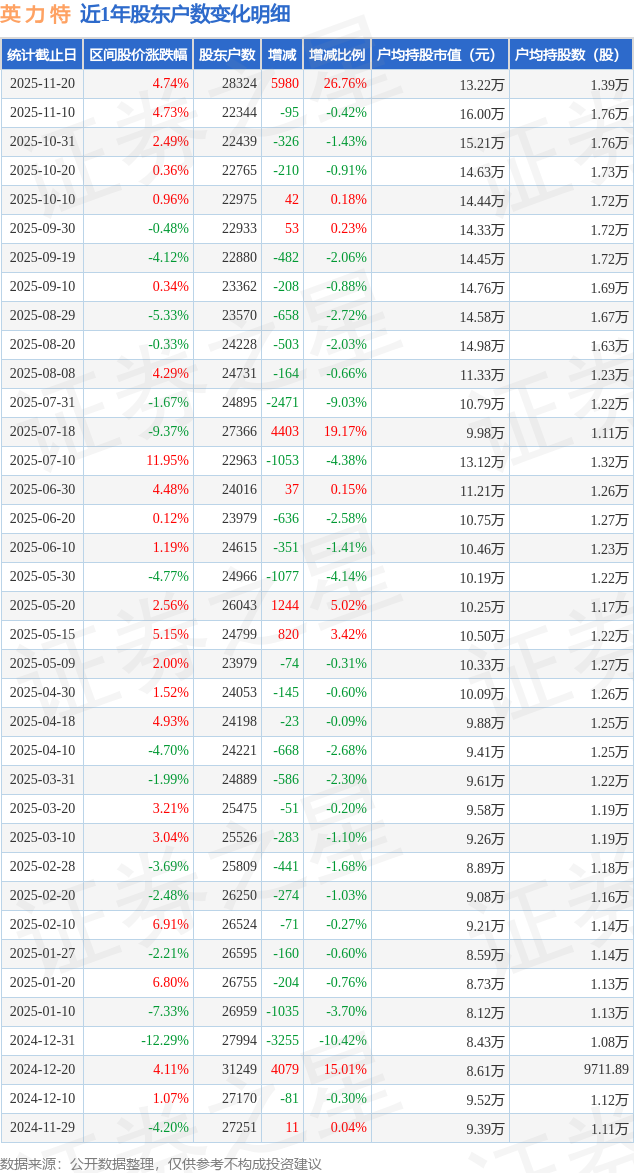 证券之星消息,近日英 力 特披露,截至2025年11月20日公司股东户数为2.83万户,较11月10日增加5980.0户,增幅为26.76%。户均持股数量由上期的1.76万股减少至1.39万股,户均持股市值为13.22万元。