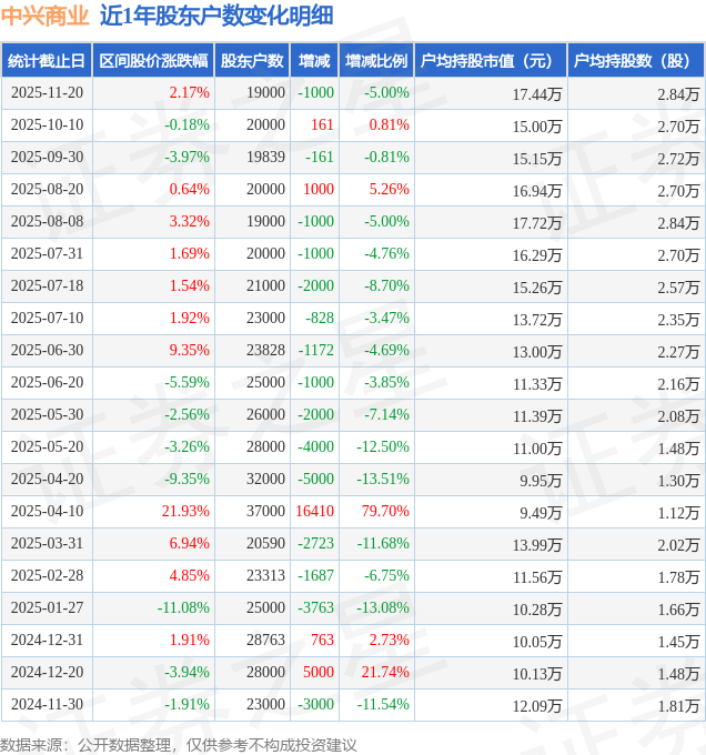 从股价来看,2025年11月10日至2025年11月20日,中兴商业区间涨幅为2.17%,在此期间股东户数减少1000.0户,减幅为5.0%。
