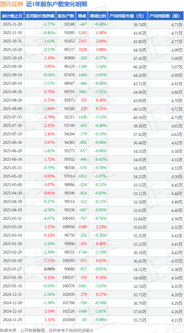 从股价来看,2025年11月10日至2025年11月20日,国元证券区间跌幅为2.77%,在此期间股东户数减少447.0户,减幅为0.48%。