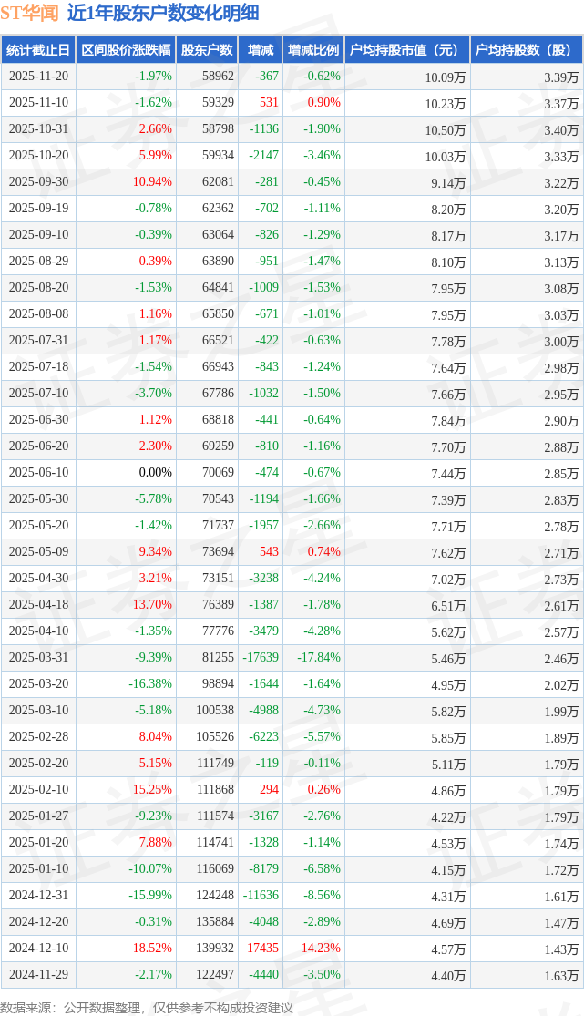 从股价来看,2025年11月10日至2025年11月20日,ST华闻区间跌幅为1.97%,在此期间股东户数减少367.0户,减幅为0.62%。